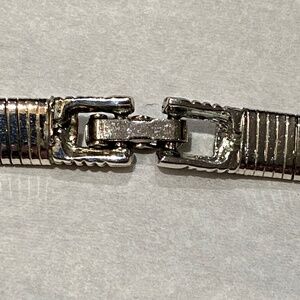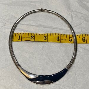 Stunning vintage–Y2K silver-tone serpentine collar necklace with a bold modernist blue enamel front design. A beautiful minimalist statement piece that sits like a choker/torque on the neckline.