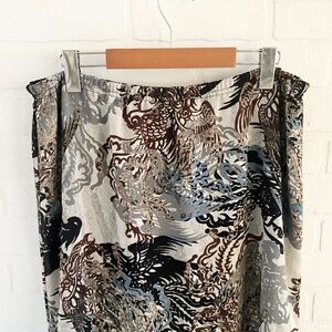 This insanely good skirt is lined and made of a lightweight fabric. The skirt is a midi length and has a mythical mixed print in shades of teal blue, brown, beige, gray, black and bone cream. It has an elastic at the waist, for an easy and comfy pull-on style. The skirt is in good condition with no visible signs of wear or damage. The fabric is soft and drapes nicely. The skirt is a versatile piece that can be dressed up or down. It is perfect for a casual day out or a more formal occasion.