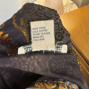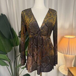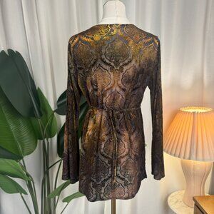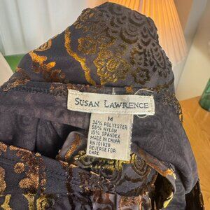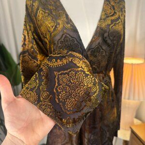 Black and gold burnout velvet tunic top by Susan Lawrence in a paisley baroque pattern, deep V-neck, empire waist, and bell sleeves in a semi-sheer blend.