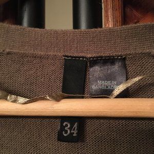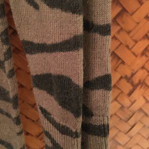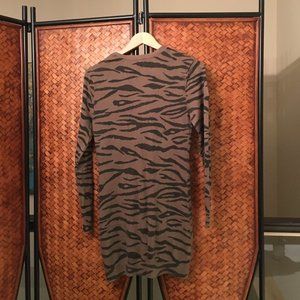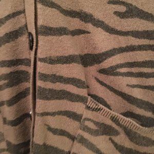 Very good preowned condition, khaki-coloured, long, button down, cardigan tunic with animal stripe pattern print by H&M Divided. Punky, soft grunge. An older divided piece in great condition.