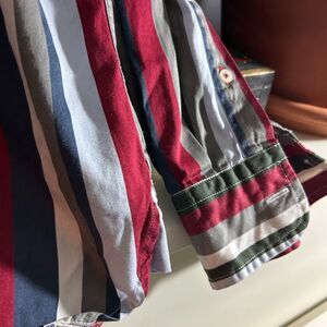 Stylish striped shirt with red and blue tones. Classic button-down design. Ideal for casual wear. Some yellowing at the neckline.