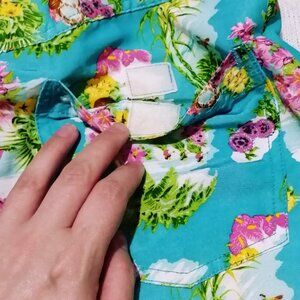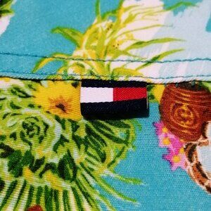 This listing is for a vintage Tommy Jeans skirt from 2001. It features a Velcro closure, a single pocket on the back, and a bright tropical print fabric. The background colour of the fabric is a lovely aqua blue/teal. This vintage skirt is in flawless condition-- no marks, tears, signs of wear etc. Immaculately clean, white whites and bright brights. The Velcro closure still works and sticks perfectly. Beautiful vintage piece in like new condition.