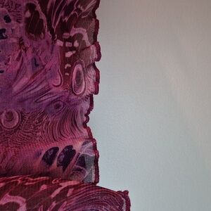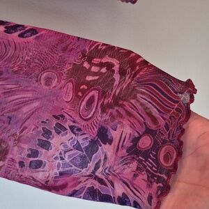 Step back in style with the vintage y2k style top. Featuring a captivating purple tone butterfly motif. This flattering v neck line top with twist at bust adds a touch of elegance while the sheer mesh overlay and sleeves creates an ethereal look.