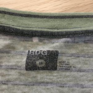 Fair preowned condition, green short sleeve t-shirt by Urban Outfitters, BDG. Features an abstract broken black striped pattern with grey, blue, white and mustard yellow blocks of colour. There's some piling from washing, but is otherwise in good shape. A thinner fabric that seems made for layering. A true to size size small. Bundle for less.