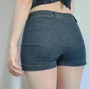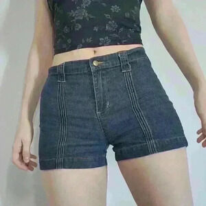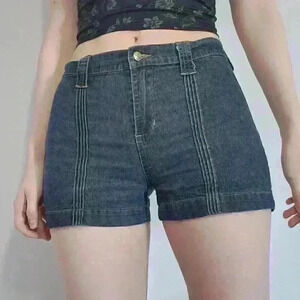 Vintage Y2K high-waisted mid-wash mini shorts with front seams from Sex So