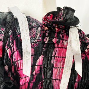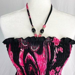 Dreamy dress for a love witch! This 00s maxi dress from CristinaLove (it adorably says "Try me once, love me forever") is gorgeous with comfortable smocking at the bust, beaded halter ties and a vibrant cerise pink and black gothic rose pattern. Looks amazing with a choker or chunky cardi!