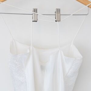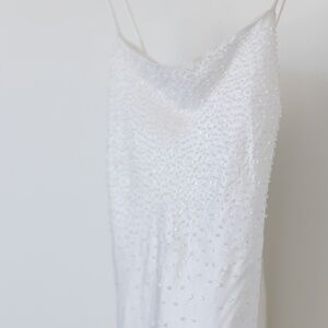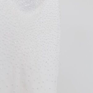 Beaded heavily on top and then trickles throughout the bottom. Fabric has an iridescent sheen to it! Very pretty. Size tag says 8 but that's vintage so check the measurements.