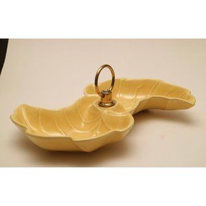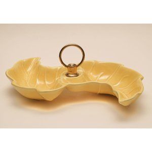 Vintage Yellow Double Leaf Relish Snack Dish/Bowl, Brass Handle, Ceramic, MCM