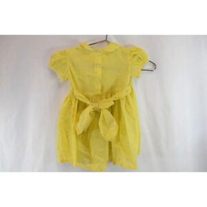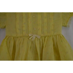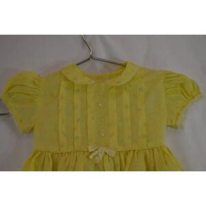 Beautiful little girl's summer dress in yellow with a tiny flower pattern. Cute cap sleeves and collar, tie at the waist, buttons up the back. Lightweight, with a full skirt, thin material, almost sheer. No brand or size tag. Vintage item, likely from the 1960s. Suitable for a child maybe 3 years old or younger?