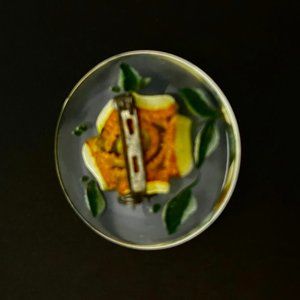 THIS BROOCH IS IN NEAR PERFECT CONDITION. SOME LIGHT TARNISHING ON THE METAL FASTENER ON BACK AS SEEN IN SCAN.