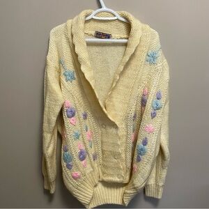Beautiful vintage yellow knit button closure cardigan with pink, blue and purple embroidered flowers and rouching on the shoulders. Approximately a women’s large based on measurements.