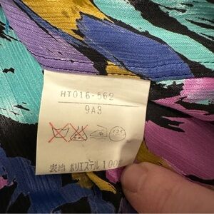 Unique and super fun vintage long sleeved Yves Saint Laurent v-neck top from the Chemisiers (blouse) line in a bold and bright pink, purple, teal, and blue floral pattern, size medium. Based on the label design and the shoulder-padded style, I estimate this is from the late 80s/early 90s time frame. Great details including shoulder pads and a row of three buttons on the right shoulder with matching buttons fastening the rolled-up cuffs.