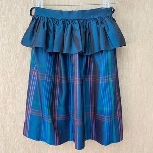 The skirt features a flattering gathered ruffle in a coordinating solid color around the waist. It continues the bold plaid pattern below the ruffle, offering a chic, coordinated look. The skirt waistband is flat in front and fabric covered elastic in back. There are loops at each side but please note that THE SASH IS MISSING.
