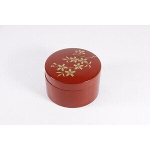 A sweet Japanese Lacquerware box in red urushi maki-e in a sakura blossom pattern. The box holds the 6 matching little sweets dishes with sakura blossom patterns in gold. Three of the dishes have 3 petals and a flower, the other three have 5 petals and a flower. All dishes and the box are in great condition with a few small signs of age and wear. I found no chips or cracks. Perfect for little candy or sweets dishes, to hold a few trinkets or to use as small coasters. The box is marked underneath with the little Zohiko elephant mark. Zohiko is a traditional high-end maker and retailer of lacquerware in Kyoto that started in the 1600s and exists to this day.