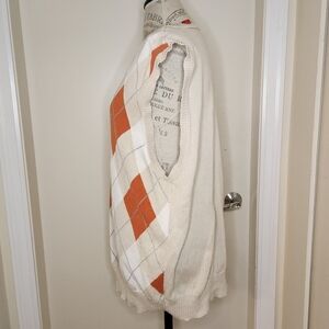 Creamy tan knit with grey white & burnt orange diamond argyle pattern Vneck sleeveless sweater vest with ribbed hems, by IZod.