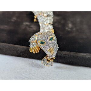 A spectacular articulated moveable cougar or panther brooch, the body made from a white metal with little bumps to mimics crystals and bright emerald green glass eyes. There are 15 moveable segments, from the paws and head to the tip its tail. Made of gold plated metal and topped in silver, it has two pins on the underside, one between the shoulders, and the other between the hind legs, just above the tail so you can position it however you like. Perfect for any dress, coat, blazer or purse!