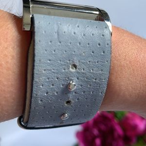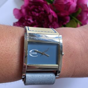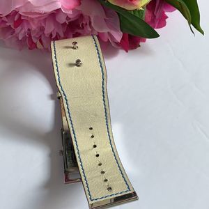 Very nice and original, one of the kind❤️ In normal used condition, have some tiny scratches from time and wear but not to noticeable when worn. Leather bracelet in good soft condition, nice combination of 2 colors and new batteries was installed last week, face 1” x 1,25”