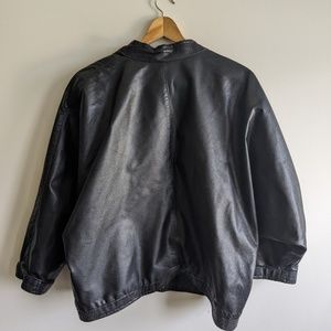 Black leather batwing jacket. Slight wear in the inside collar, as seen in photo.