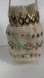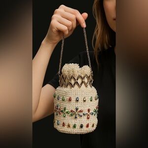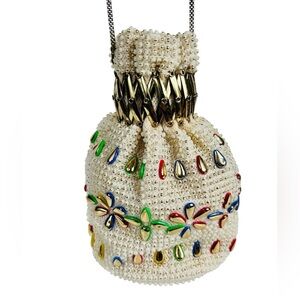 STUNNING vintage evening white sparkling beaded bag, with gold toned metal retractable closure, silver colored chain strap, pattern of colorful stone beads. Bag is lined with white muslin. All beads are there. Lining has brown spots, appears to be part of the fabric.