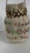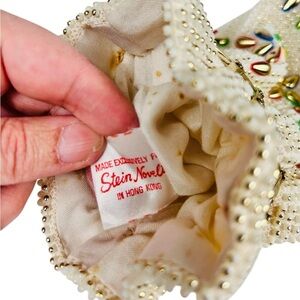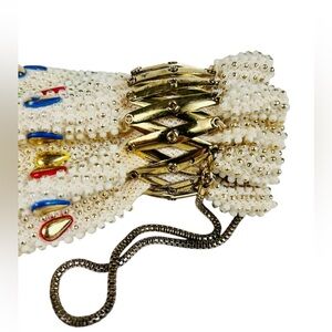 STUNNING vintage evening white sparkling beaded bag, with gold toned metal retractable closure, silver colored chain strap, pattern of colorful stone beads. Bag is lined with white muslin. All beads are there. Lining has brown spots, appears to be part of the fabric.