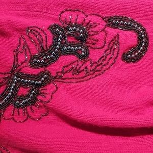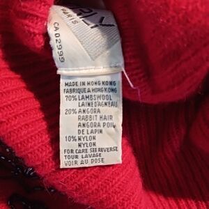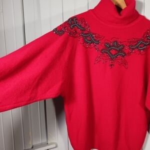 Red vintage beaded lamb and angora wool blend turtleneck with dolman sleeve.