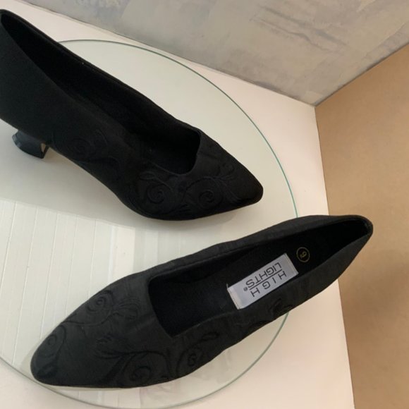 Vintage, black brocade, kitten heeled, size 9