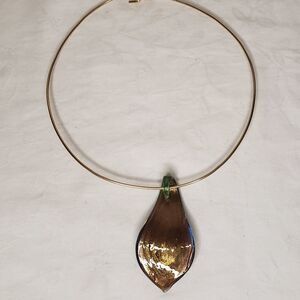 Vintage 1970s gold tone hoop choker necklac with hook clasp and beautiful speckled gold sparkly rainbow blown Murano glass pendant.
