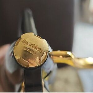 Design: It features a teardrop shape in black with gold-plated accents and a distinctive gold square pattern around the base.