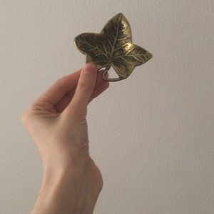 A beautiful and unique vintage jewelry or trinket dish shaped like an ivy leaf with a curved stem. There is normal wear and patina that adds to its charm (see photos). It seems to be brass but I'm not sure of the exact type of metal. The bottom has 3 little "feet" for the tray to rest on a flat surface. It would look great on top of a dresser, desk, bookshelf, or coffee table. It could be used to hold jewelry, paperclips, coins, keys, etc. Priced a bit higher due to its uniqueness but feel free to make me an offer.