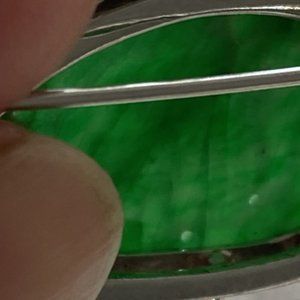 Everything is in very good condition.The diamonds are well set, apparently by hand. When viewed under significant magnification, there appear to be 2 or 3 threadlike vertical fissures on the brooch (somewhat visible in the last picture, I think) . They do not go right though the piece and should not affect its integrity or appearance. (t)