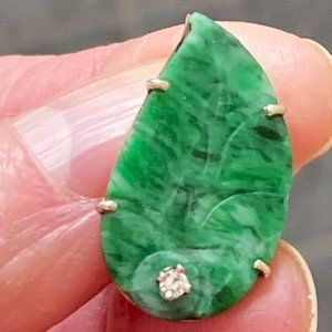 The brooch, which is cut from richly coloured and mottled jadeite, is finely etched and features a pinhole design. It is framed in 10K white gold (unmarked but tested) and adorned with some 19 diamonds of 88 cut (8 sides and 88 facets). It measures just under 1-1/2" X just under one inch, weighs 7.44 grams and is stamped on the back: Hand Made.