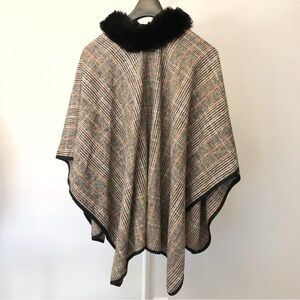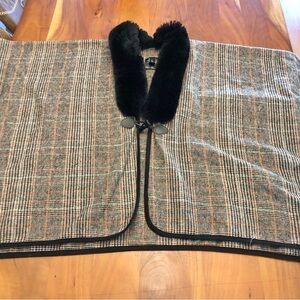 Vintage brown & beige plaid cape/poncho with black faux fur collar.