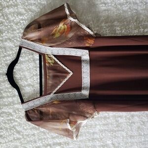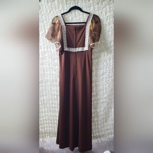 Vintage brown maxi dress with lace detailing and butterfly sleeves. zippered back. has 1 small hole in back, see photos. priced accordingly