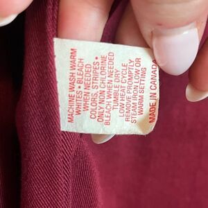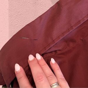 Amazing vintage coat with embroidered wolves. Burgundy colour utility style coat with wolves on front and back. Cinch-able waist, hidden hood, zipper and snap buttons. Canvas lined. Really nice and heavy, quality coat. Size men’s medium but fits a women’s XL. One tear in the back of the collar, otherwise great condition.