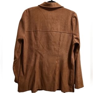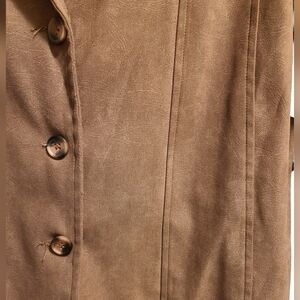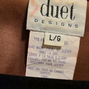 Button-up top with a unique jacquard print that resembles a cracked sort of texture. The top is unlined, but the fabric is a thicker polyester. Made in Canada. Excellent used condition.