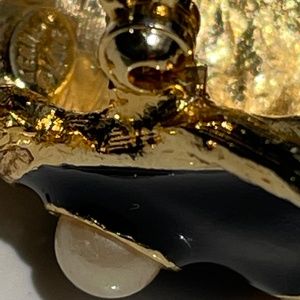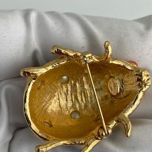 Vintage gold plated Ladybug pin brooch by Kenneth Jay Lane. This colorful critter features a golden body painted with black enamel faux pearls and coral beads. Like new condition.