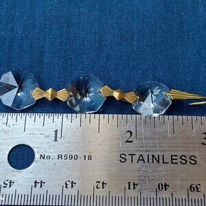Each octagonal crystal is 1.3 cm across. They are in strands of 3 with brass connectors in between. You get a group of 10 strands. Each strands with hook and connectors is 7.5 cm long. The bottom crystal does not have a bottom hole.