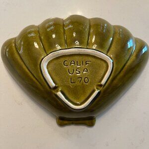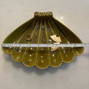 Calif USA L70 pottery trinket dish in avocado green. Tiniest chips on a couple of scallops, hardly noticeable. Jewelry added for scale and not included.