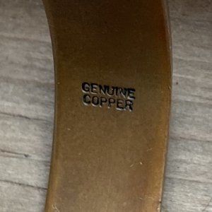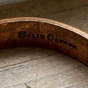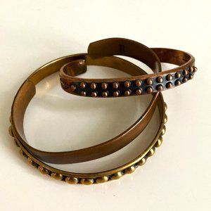 One simple copper cuff, one etched, with raised dots in the centre panel - and a raised dot brass bangle. The brass bracelet is 2 inches in diameter. The plain copper cuff - marked Genuine Copper - is about 8 inches in circumference including the opening and can be somewhat pinched or expanded. The patterned copper cuff - marked Solid Copper - is just over 7 inches in circumference, with not much adjustment possible due to its thickness. All in very good condition.