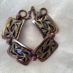 4 brass tone detail leaf motif segments with lobster claw clasp and safety chain. Approximately 6 to 6.5” long.