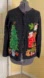 features various festive appliqués and embellishments, including a Christmas tree, Santa Claus, a fireplace with stockings, and a cat - including the back