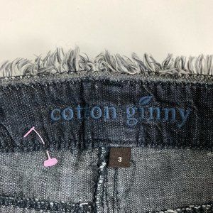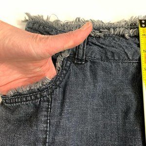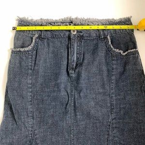 Super cute denim skirt with a bit of stretch, embroidered with a blue thread and has a raw edge at waist and hem.