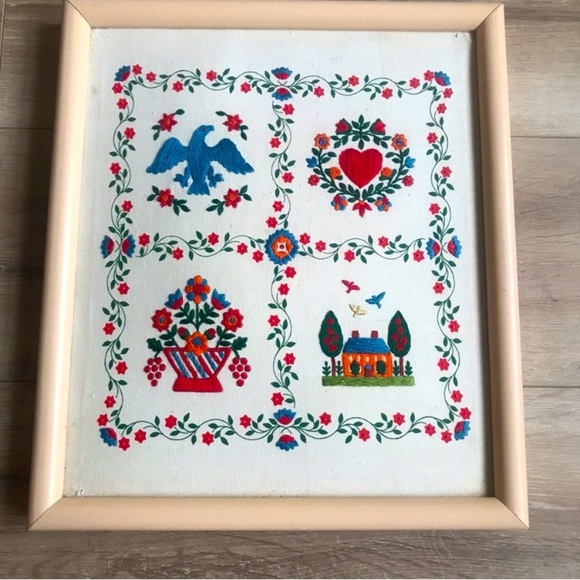 Vintage crewel handmade wall hanging cottage birds floral bohemian vibes