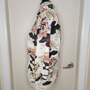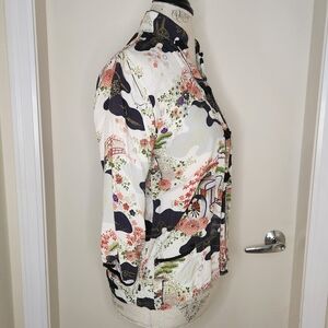 Vintage Near Antique 1930s, Made in Japan, 100% silk, mini front patch pockets, black edges, pops of purple, gold butterflies, Very Old, belonged to my Great Aunt, Used Condition, many tiny flaws that aren't noticeable until up close, Size S/M.