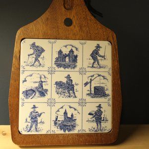 Vintage delft blue ceramic tile and wood cutting board