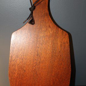Lovely blue and white ceramic tile set in wooden cutting board. Leather strap.