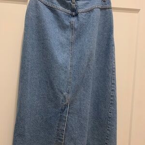 100% cotton sturdy denim skirt. Great vintage condition. Buttons up the front and pockets. High rise. 14” waist.
