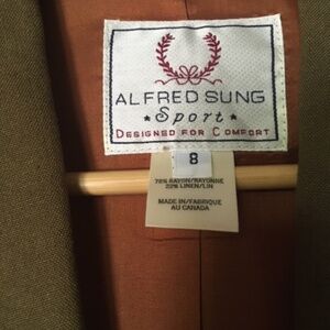 In like-new condition. Fabric lies lovely; Alfred Sung 2 piece suit. High waisted pants that taper at ankles (think 'zoot ' suit!). Fabulous, Western- style vibe. Slight rub spots (from hanger clips on top of pants (one either side), on fabric rubbing against zipper on pants). Extra button provided for open-style, fully lined jacket. I love this suit and wish it still fit me! I wore it without the western style buttons - but can be provided. A very put-together look.