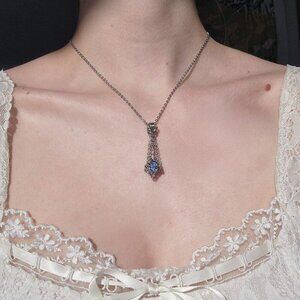Vintage elegant blue pearl basket necklace with a small silver chain