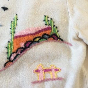 Cream colour wool and felt Mexican souvenir jacket from the 1950s. Beautiful embroidery of plants and people. Pleated detail on the top of the shoulder. The bottom of sleeves, collar, and front panels of jacket have a pink and white embroidered detail. There are signs of wear, fabric a bit thinner in some areas on the back, a couple of spots, the most obvious is a rust colour spot shown in the 9th image (on the back of the coat). This jacket also has some blurring/fading of the embroidered colours from what looks like machine washing-this piece is priced accordingly. There are no closures, this piece was meant to be worn open. Measurements are: Bust max: 37", Waist max: 32", Hips max: 37", Length in front 23.5", length in back 26". Let me know if you have any more questions.